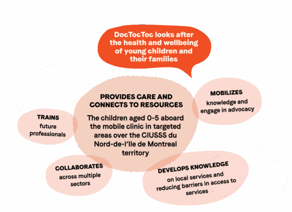 The mobile clinic’s operations allow DocTocToc’s team to conduct research, principally on proximity health services aimed at vulnerable families, health inequities and barriers in access to healthcare for children aged 0 to 5.